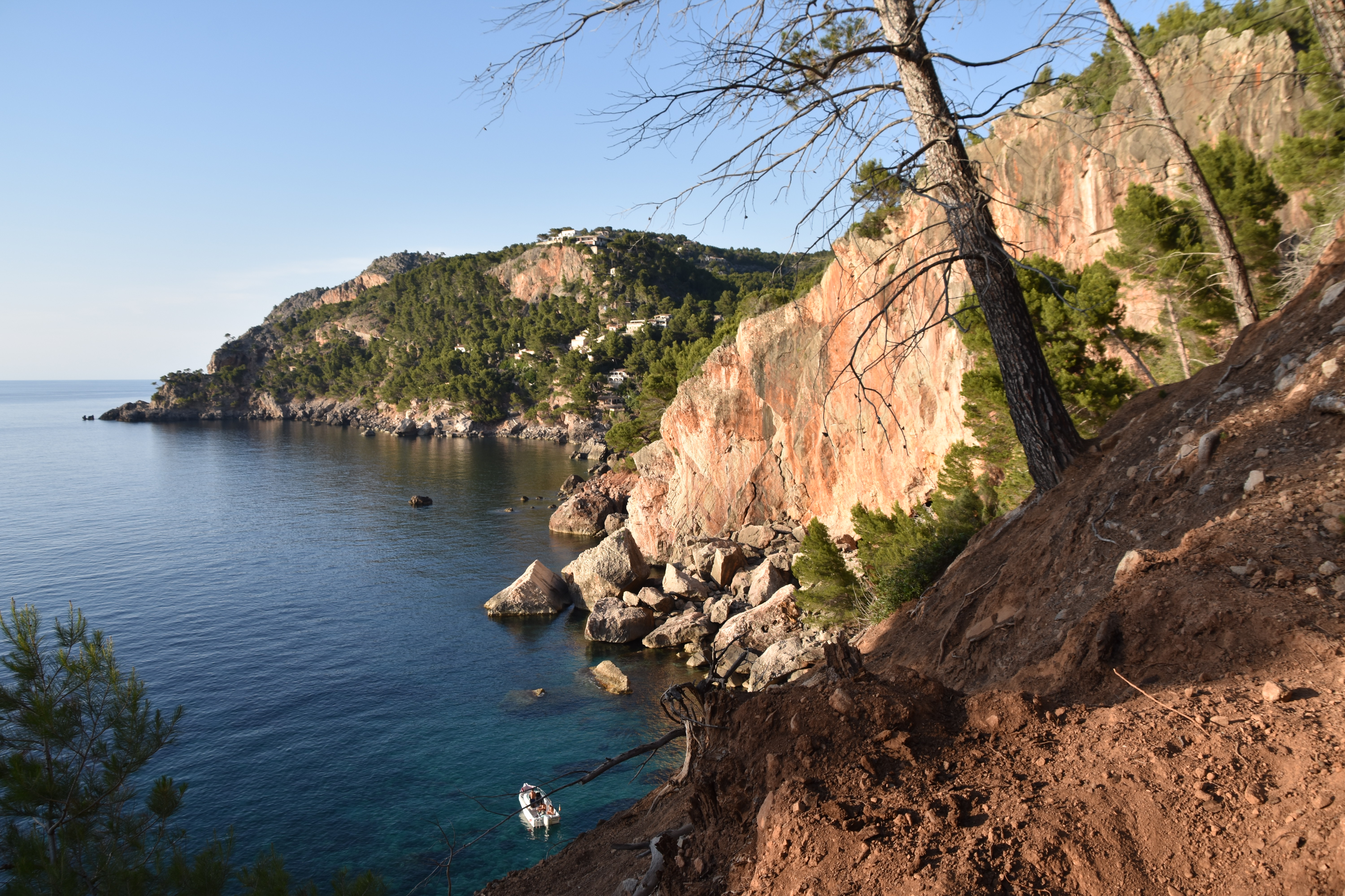 A partir de ahora, nuestra ruta discurre por estrechos márgenes cortados sobre la pendiente escarpada, rozando el acantilado. Es el que algunos identifican como el Camí de Baix, que unía Deià y la cala con Alconàsser y Béns d’Avall, ya dentro de Sóller, y que pasaba por Llucalcari. En conjunto, un itinerario opuesto al Camí d’Amunt o del Grau, llamado también de Son Coll o de Castelló.