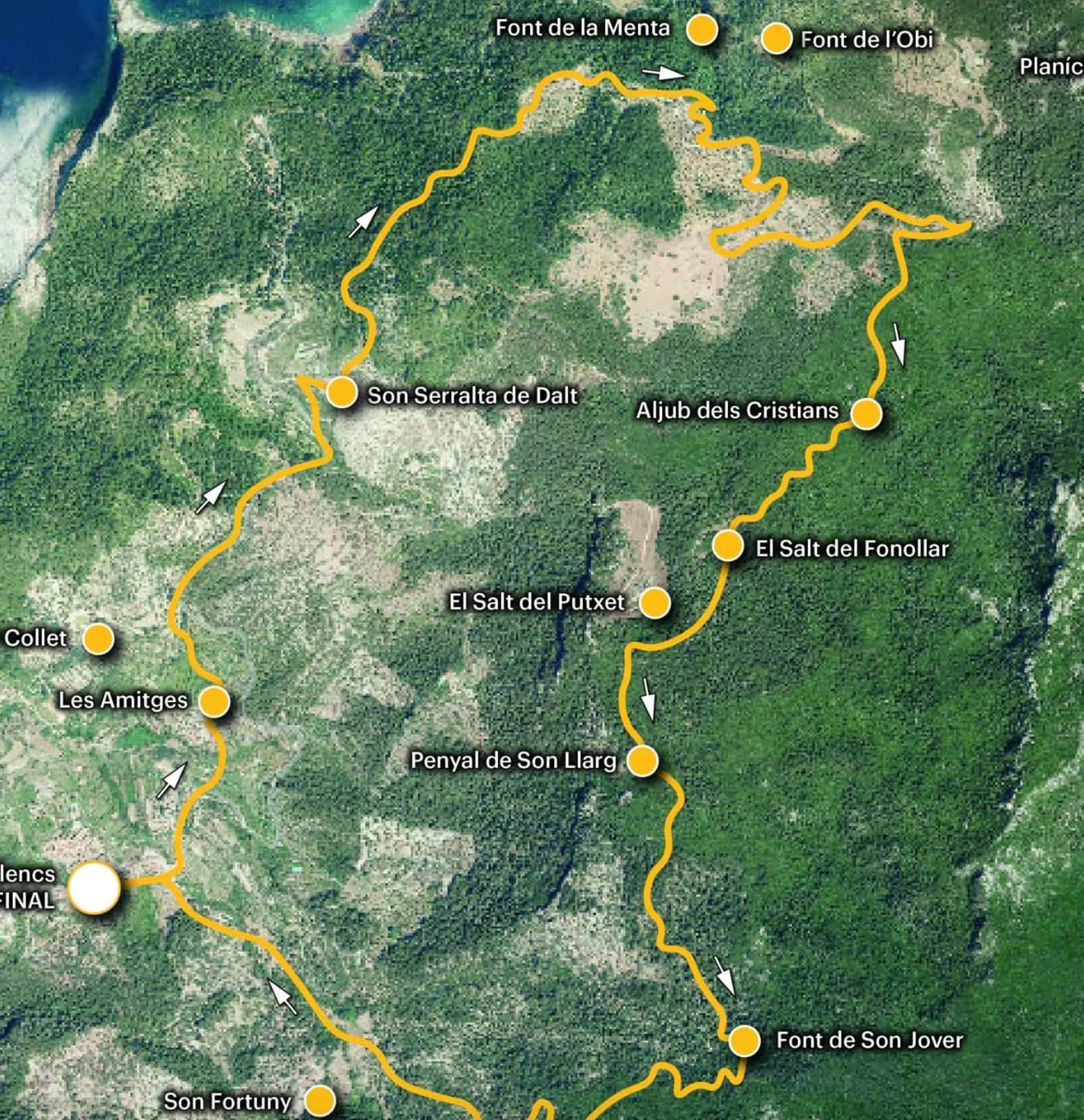 [1 h 30 min] El aljub dels Cristians es de planta rectangular, con bóveda de cañón y la boca abierta hacia poniente. Tiene una pequeña balsa que recoge el agua de la ladera mediante una acequia excavada en el suelo. La boca fue tapiada con bloques de marés para servir como filtro. Continuamos nuestra ruta por el mismo camino y dirección por la que llegamos, hacia suroeste. Tras unas curvas muy pronunciadas, y un tramo de camino de herradura, salimos a un nuevo camino de carro [1 h 45 min], donde la ruta de la finca pública indica ir a la izquierda. Nosotros, en cambio, giramos a la derecha hasta entrar en una estrecha vaguada, con una pared divisoria a la derecha, perpendicular a la ladera de la montaña. Debemos dirigirnos hacia ella y ver un portillo en la valla de alambre que nos permita cruzar Planícia hacia la posesión del Salt del Fonollar. Una vez cambiamos de dominios territoriales, el sendero desciende suavemente hacia unas terrazas soleadas, rodeadas de un bosque denso, tras el cual encontramos las casas de la posesión [1 h 55 min].