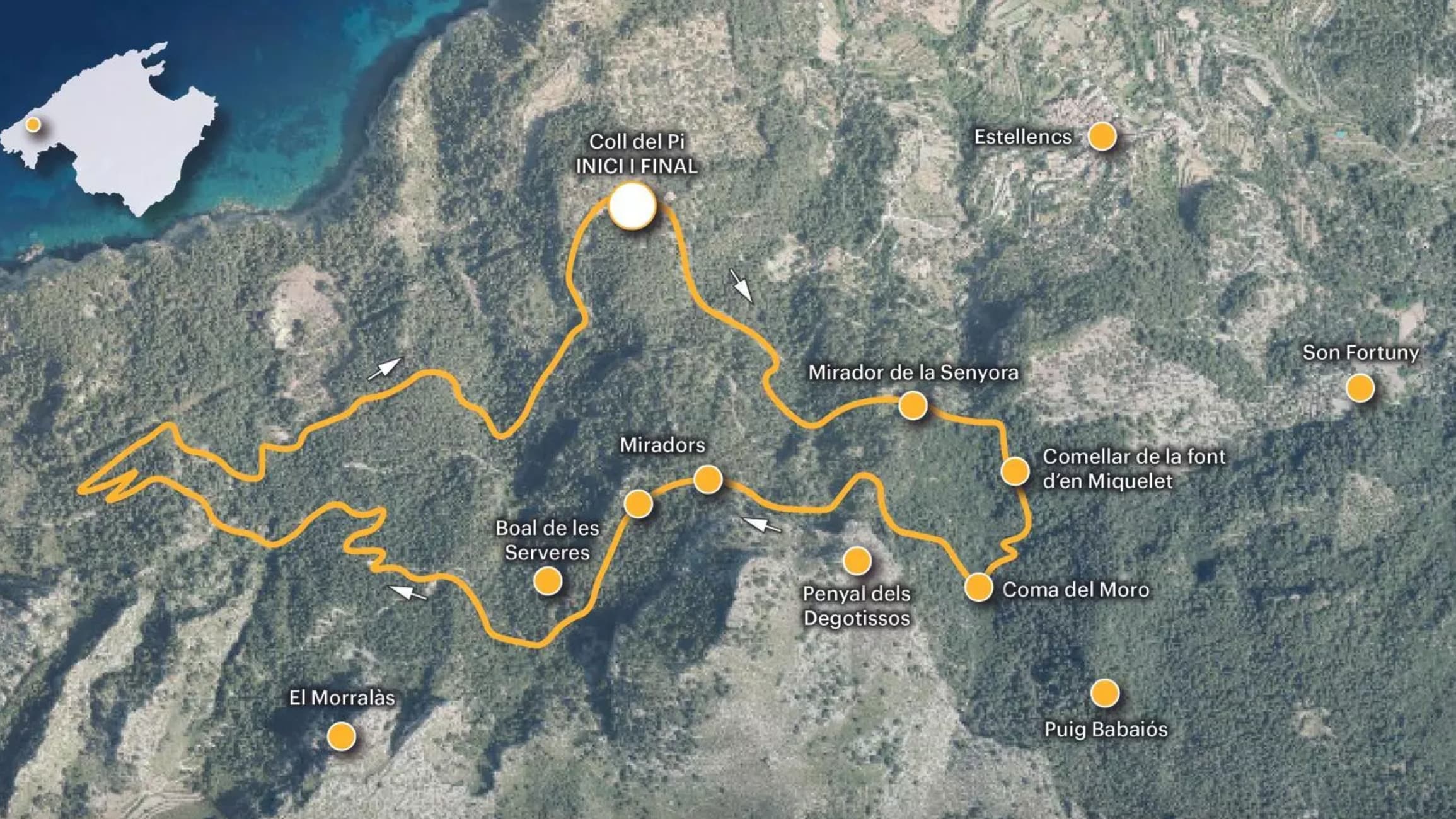 En este itinerario, visitamos nuevamente las tierras de Son Fortuny. Hoy dividida en dos, fue la posesión más grande de Estellencs y se extiende por la vertiente de Tramuntana del puig de Galatzó (1.027 m). En 1981, el Consell Insular de Mallorca adquirió una franja de 283,5 ha (de un total de 663 ha), situada en la parte meridional y menos productiva de la finca. Ocupa la parte más alta del municipio y limita con otras posesiones tan significativas como Son Fortesa y Son Nét, en Puigpunyent; Galatzó, en Calvià; y la Coma, el Grau, el Salt d’en Fenollar y el Salt del Putxet, en Estellencs. La caminata que proponemos se inicia en el coll del Pi, donde hace años encontrábamos una gasolinera y un restaurante. Desde aquí, siguiendo antiguos caminos de carro y de herradura, rodearemos por encima de los riscos de la Boal de les Serveres, transitando entre el dominio público y privado de Son Fortuny.