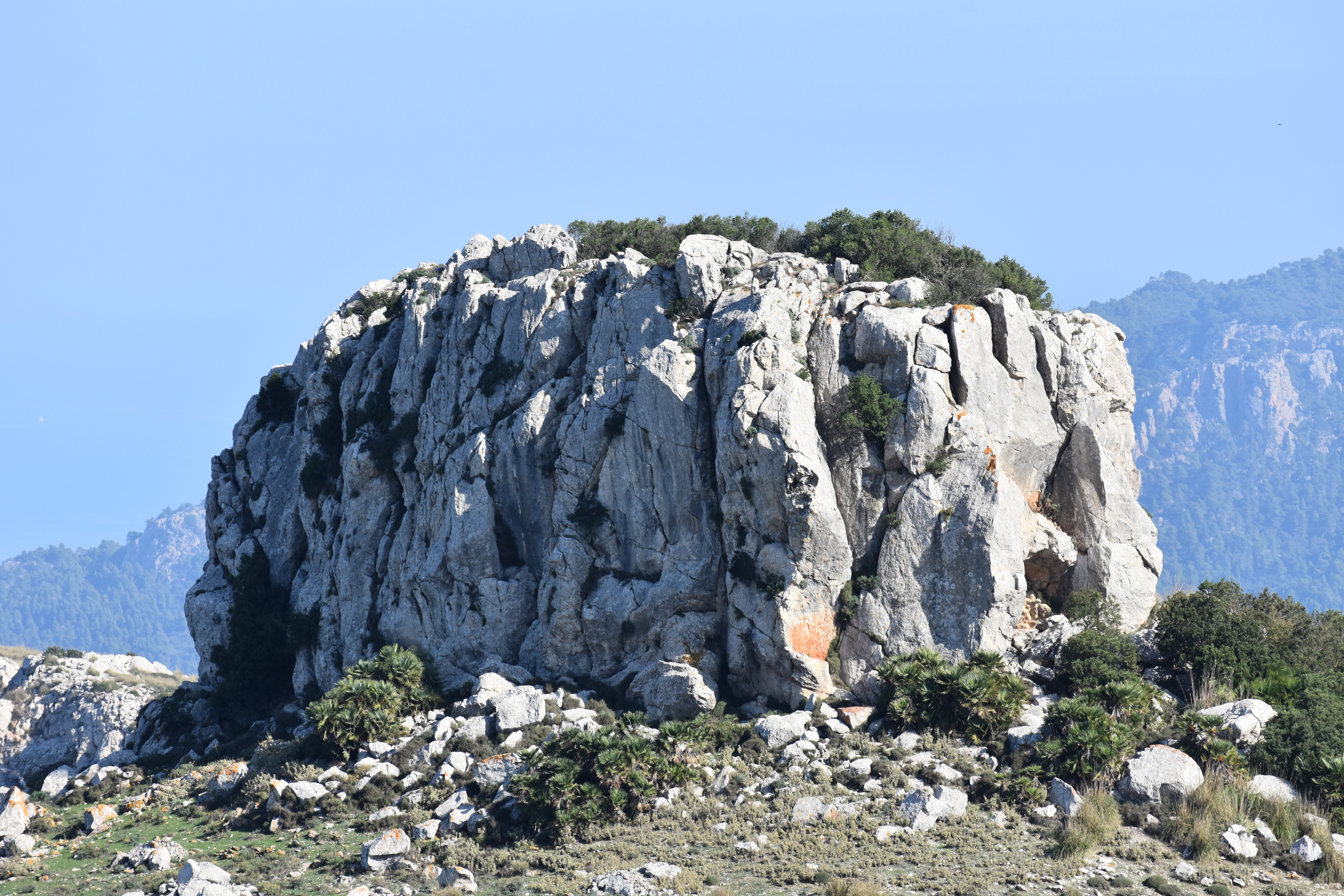 1h50’ Al llegar a la colina de la Coma d’en Vidal, seguimos todo recto –oeste-suroeste- en dirección a s’Esclop. 2h00’ Alcanzamos un llanito; el camino pasa por encima de una era (era d’en Coll), cerca de la caseta de s’Esclop, restos de la ocupación humana de unos viejos barbechos que se extendían por aquel lugar. El sendero es decanta hacia una pared que baja perpendicular a la Mola, justo después del Castellet, un peñasco lozano que dejamos a la derecha. 2h10’ Al otro lado de la pared encontraremos dos senderos. El primero baja hacia la fuente del Quer y el Grau. Nosotros cogeremos el segundo (sur-suroeste), un poco más arriba a la derecha, que en una clara subida nos llevará a voltear s’Esclop y a buscar el sitio para poder subir por la vertiente de detrás que se asoma por encima de la Alqueria de Andratx.