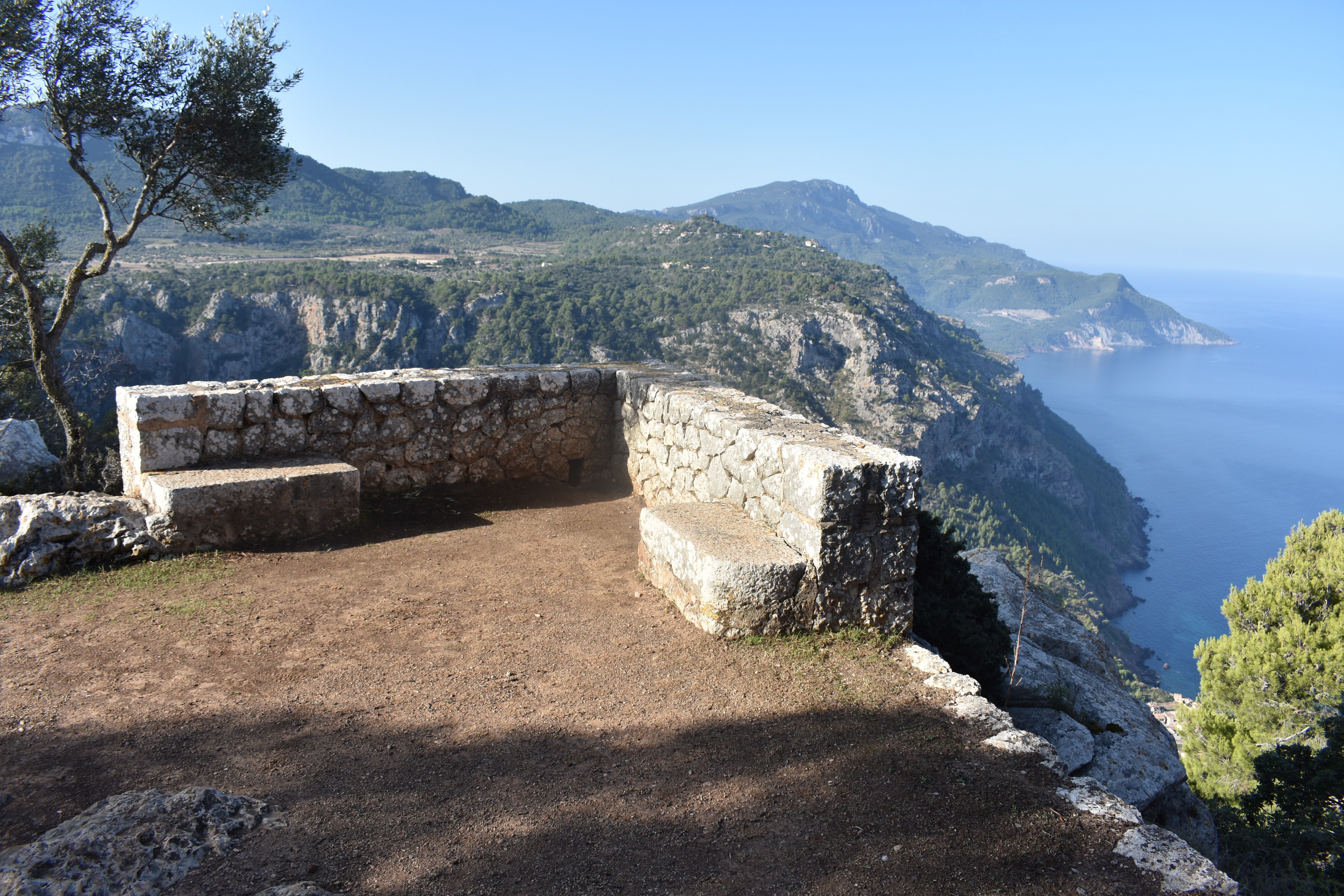 Cogemos el camino de la derecha, que, haciendo como lazos, inicia una rápida subida, primero hasta el Portalet [45’], una muralla medieval de carácter defensivo, y después hasta s’Ullastrar. [55’] Alcanzamos un rellano mientras el camino de herradura gira a la izquierda, en dirección norte, bordeando la linde de Son Mas. A partir de ahora, el itinerario no tiene pérdida y uno tras otro veremos al lado izquierdo los miradores del Arxiduc. [1h 00’] El primero es el del Barranc. Acto seguido, atravesaremos la Planeta y, una vez franqueada una pequeña barrera de madera y alambre, a unos treinta metros, [1h 07’] aparece el mirador del puerto. [1h 09’] A continuación, viene uno de nueva planta, con un banco de hierro y una barandilla de madera. El siguiente es de la Volta de s’Escolta, [1h 19’] el más pequeño de todos.